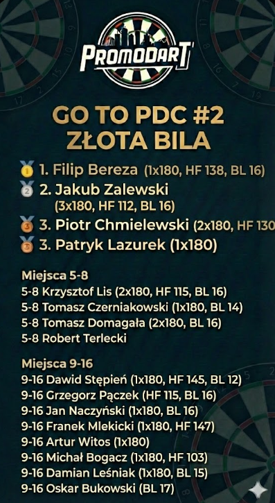 To był historyczny wieczór na Ochocie! Drugi turniej cyklu „Go to PDC” w Złotej Bili przyciągnął aż 109 zawodników, co jest rekordem i jasnym dowodem na potęgę warszawskiej sceny. Zawodnicy walczą o punkty w trzech lokalizacjach (Echo, Złota Bila, Cafe Rama), by dostać się do grudniowego Mastersa i bić o dofinansowanie na Q School 2027. Przykład Filipa Berezy z Promodart Team, który zdobył kartę Pro Tour, pokazuje, że warto walczyć o każdy punkt. Sam Filip uświetnił ten wieczór swoją obecnością, choć droga do finału w tak gęstej drabince była mordercza.