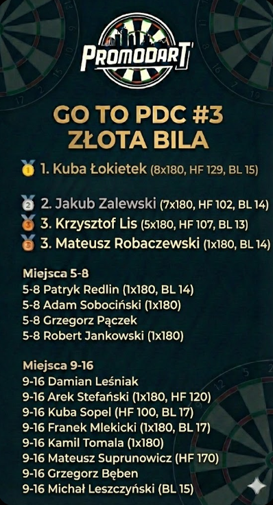Rywalizacja w cyklu „Go to PDC” nabiera morderczego tempa! Trzeci turniej w Złotej Bili na Ochocie po raz kolejny przyciągnął szeroką stawkę zawodników walczących o punkty do rankingu lokalnego. Przypominamy, że stawką jest awans do grudniowego turnieju Masters (Top 16 z Ochoty, Top 10 z Tarchomina, Top 6 z Bemowa), gdzie do wygrania jest pięć dofinansowań na Q School 2027. Sukces Filipa Berezy z ProModart Team, który przeszedł tę drogę i zdobył kartę Pro Tour PDC, jest najlepszym dowodem na to, że warto walczyć o każde „oczko”.