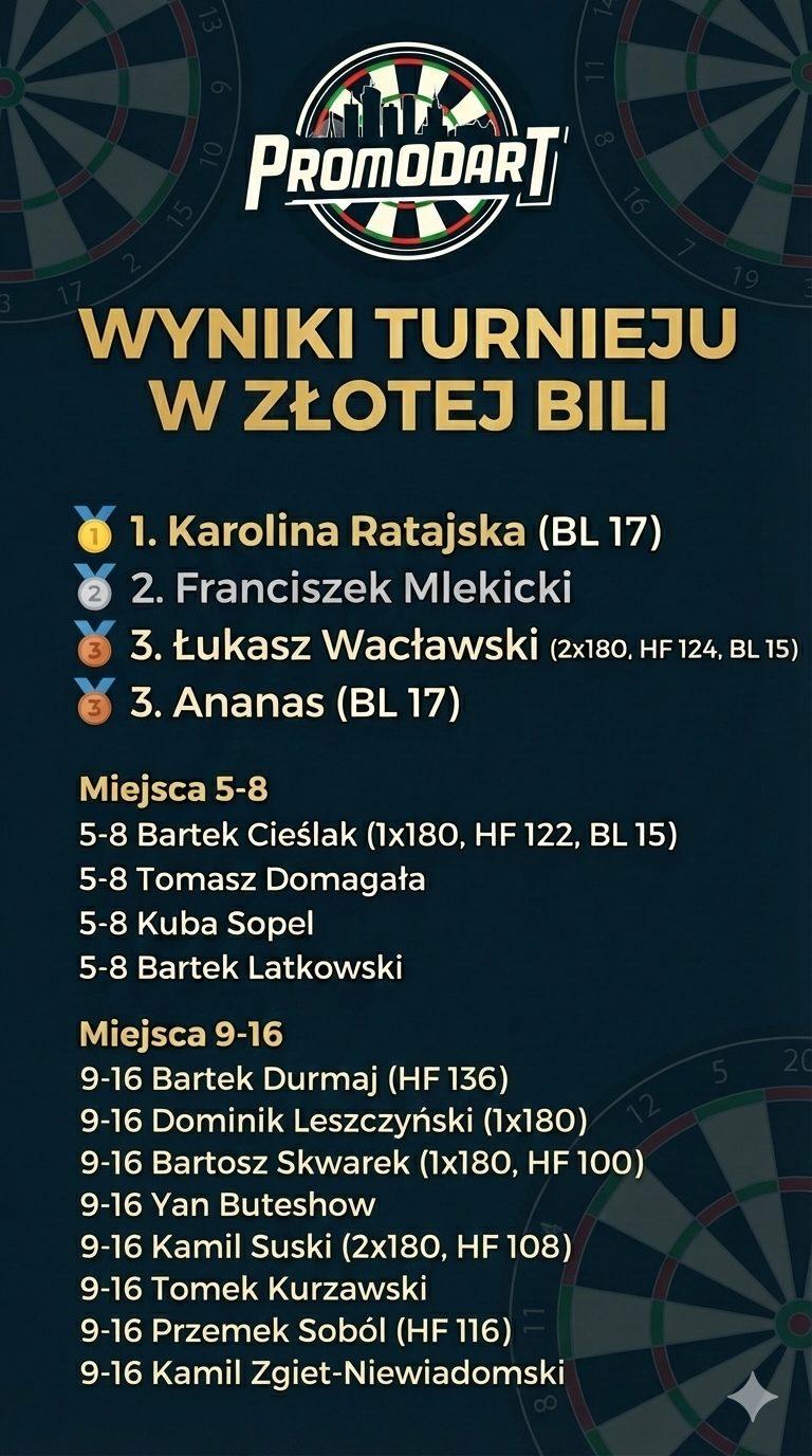 Kolejna środa w Złotej Bili upłynęła pod znakiem wysokich średnich i ogromnych emocji. Na starcie zameldowało się 62 graczy, co przy nieco mniejszej frekwencji niż na rekordowym turnieju noworocznym, pozwoliło na jeszcze bardziej dynamiczną i płynną rywalizację. Widać było, że zawodnicy na dobre zadomowili się w nowym roku, a ich dyspozycja na tarczach steelowych z tygodnia na tydzień rośnie. Wieczór należał bezsprzecznie do kobiet i młodych talentów – Karolina Ratajska pokazała klasę, sięgając po końcowy triumf.